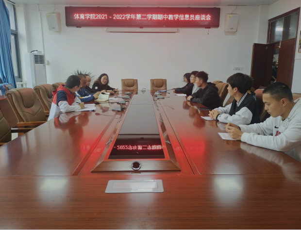为了进一步加强体育学院的学风和教风建设,及时准确地了解和掌握相关的教学信息,5月23日下午5点,在体育学院会议室召开了2021-2022学年第二学期教学信息员会议,体育学院副院长刘宁、教务科长刘建国、学生科科长谢迪和教研室主任韩志敏及7名教学信息员参加了本次会议,会议由刘宁副院长主持,刘宁教授首先感谢了教学信息员对体育学院教学工作的支持,然后强调教学信息员一定要及时记录、反馈班级学生的学习情况、课任教师的教学状况等信息,积极配合教师的教学工作,做好班级的学习管理工作。