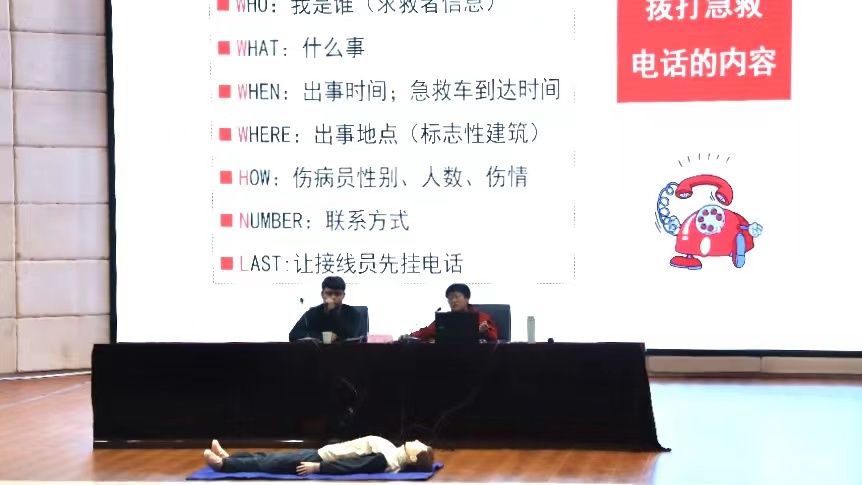 讲座上,何萌围绕伤情判断、止血、包扎、固定搬运等正确的创伤救护方法进行了详细讲解,并借助道具现场演示了操作步骤、精心示范了心肺复苏术、海姆利克急救法等救护技能。讲座以近期发生的踩踏事故为例,向大家强调了现场救护培训的重要性和必要性,应急救护的目的、原则和程序,并详细说明严重威胁生命的危险因素。