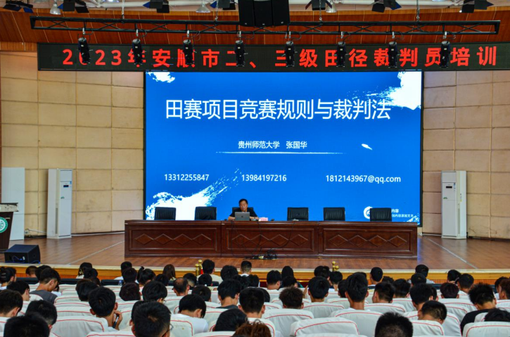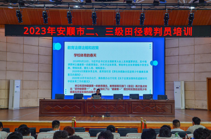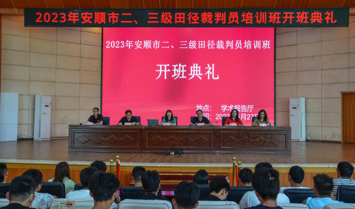近年来,我市举办的田径竞赛活动不断增多,田径运动在我市有着十分广泛的群众基础。为进一步提高我市田径竞赛的组织水平,加强田径裁判员的人才培养,安顺市文体广电旅游局函请省田径协会于2023年5月27日至28日在安顺学院学术报告厅举办了二、三级田径裁判员培训班。本次培训邀请到贵州田协副主席(田径国际裁判)张优誉,田径国际级裁判张国华给所有学员做培训,参加培训的学员由各县区和有关单位根据相关要求进行推荐。通过培训并考核合格的学员,将颁发中国田径协会统一制定的二、三级裁判员证书。本次培训活动由开班典礼、裁判业务学习、裁判技能实践和理论考试四个部分组成。开班典礼上,安顺学院体育学院院长邓文红在致辞中,表示了对培训活动成功举行的祝贺、同时对组织此次培训活动的团队表示了感谢。