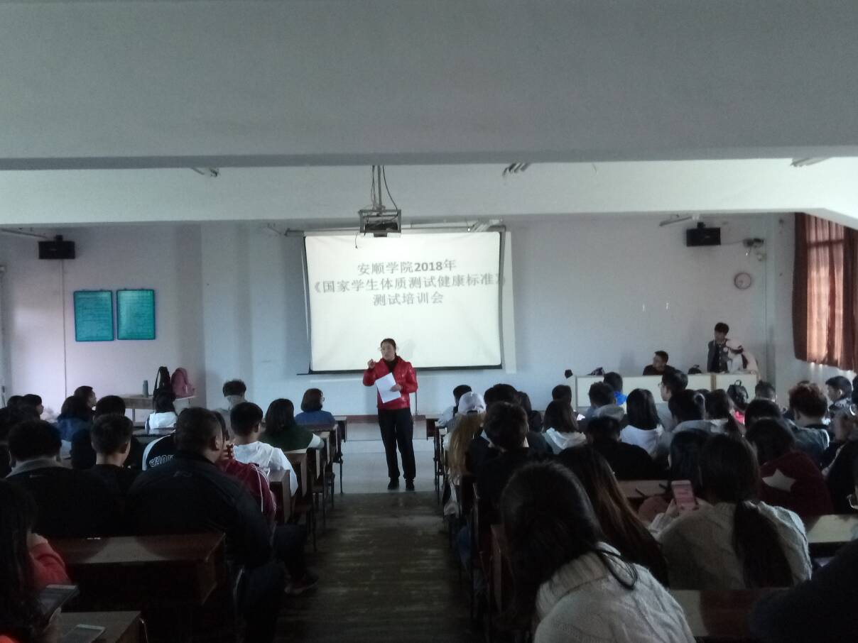 根据贵州省教育厅、省发改委、省财政厅、省体育局印发《关于进一步加强学校体育工作的实施意见》的通知(黔教办体﹝2015﹞73号)文件精神和《学生体质健康监测评价办法》及《高等学校体育工作基本标准》的有关要求,为切实加强我校2018年学生体质健康标准测试和上报工作,体育学院于2018年3月30日在学校电教楼0941教室对体育学院测试小组和各学院的体育部长及各班体育委员进行测试前的培训。培训主要针对测试小组如何对接所负责的学院,各班体育委员如何与体测数据组各学院联络员对接录入各班体测数据,并对所需填写的测试项目、测试要求及各类表格的填写规范作了培训。最后,负责本次体测工作的副院长刘宁老师对参与此次测试工作的老师和学生提出了测试要求,对大家参与此次测试工作表示衷心的感谢。(文/图体育学院)