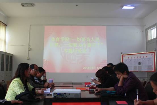 2014年5月12日下午14点30分,体育学院党总支组织全体党员干部、教职工代表和部分学生党员在党员活动室开展党的群众路线教育实践活动第十次集中学习和“一切要为人民打算,一切要为小康苦干”专题讨论会。会议由党总支书记杨莉莉主持。