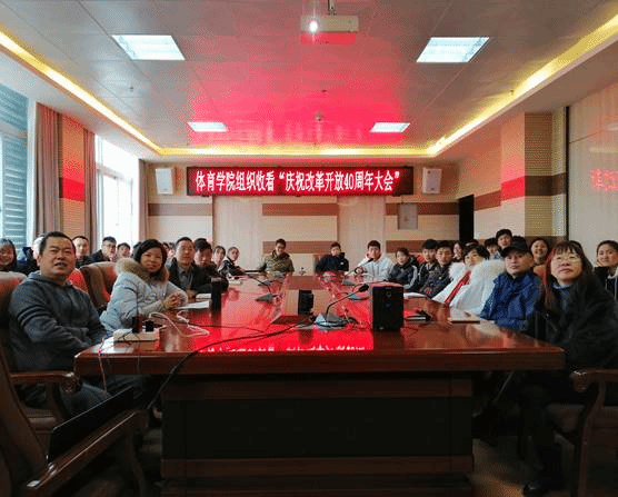 为收看“庆祝改革开放40周年大会”在北京人民大会堂隆重举行。体育学院于12月18日上午10时组织全体教职工党员和学生党员收看了大会现场直播。学院领导班子和全院党员在特教楼六楼会议室集体收看了庆祝大会的直播,全院教职工在自己的工作岗位上通过电台和网络在线收听收看了大会。