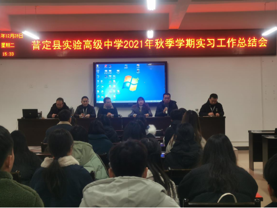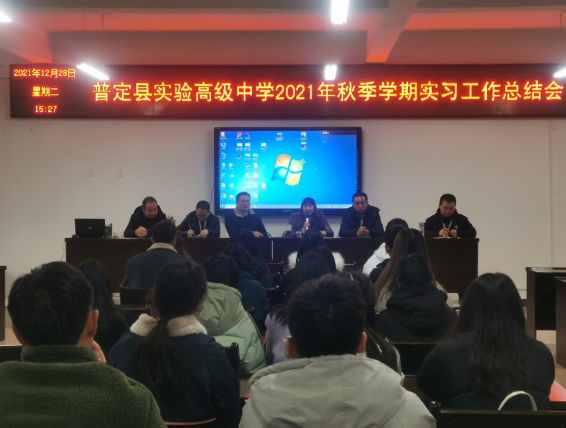 下午14:30分,普定县实验高级中学召开全体实习生工作总结会,参加会议的有普定县实验高级中学校长卢启程、副校长马凡军、党支部书记、副校长张霄、教科研主任胡满成,安顺学院体育学院院长邓文红,贵州师范学院实习生领队教师廖明洪以及全体实习生。总结会上,贵州师范学院、安顺学院实习教师代表先作发言,分享他们实习以来的成长与收获,并对学校领导、教师的关心和指导表示感谢;教师发展中心主任胡满成就实习教师实习工作做总结汇报,在实习期间,所有实习生都出色完成了所有实习任务,达到了优秀标准。会议中段,所有参会人员观看了贵州师范学院和安顺学院实习教师记录实习生活的视频,视频真实记录了实习教师们在普定县实验高级中学实习工作和生活中的点点滴滴。观看完展播视频后,贵州示范学院领队教师廖明洪和安顺学院体育学院院长邓文红先后发言,他们对实验高中给予实习生无微不至的关怀、耐心指导的学校领导和老师表示感谢,对实验高中高标准、严要求的实习工作表示赞赏,并希望所有实习生在今后的工作学习中,要勇于创新,适应新时代的竞争和发展。最后普定县实验高级中学校长卢启程总结发言,充分肯定了实习教师们虚心好学、刻苦努力的工作学习态度和积极进取、朝气蓬勃的精神风貌,给实验高中的校园增添了生机和活力,同时也为学校的发展奉献了很多。实习的结束并不代表与实验高中的纽带就终止,他希望他家在今后的学习和工作道路上要不断进取、不断创新,为社会做出更多的贡献。