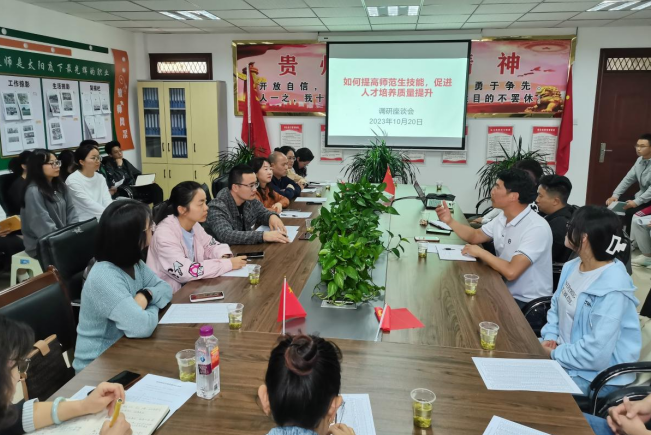 上午9点30,在实习基地会议室召开座谈会,实习学校负责人曾明贤主任从工作、学习、生活等方面汇报、总结、评价2024届实习生实习情况,特别对实习教师的师德师风培养、课堂教学、班主任工作实习等做了详细介绍,并对下半学期实习工作做了要求与规划。