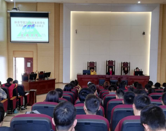 2019年3月4日中午12:30分,体育学院在新教一楼模拟法庭召开了“体育学院2018级本科学生大类招生分流指导培训会暨分流方案调研会”。本次会议参会人员有体育学院院长邓文红、体育学院副院长刘宁、体育学院党委副书记林金茹、大学公共体育教学部副主任王丽平、体育学院教师刘建国、孙春利、佘丽红以及体育学院2018级全体同学。本次会议由体育学院专职辅导员田宇主持。