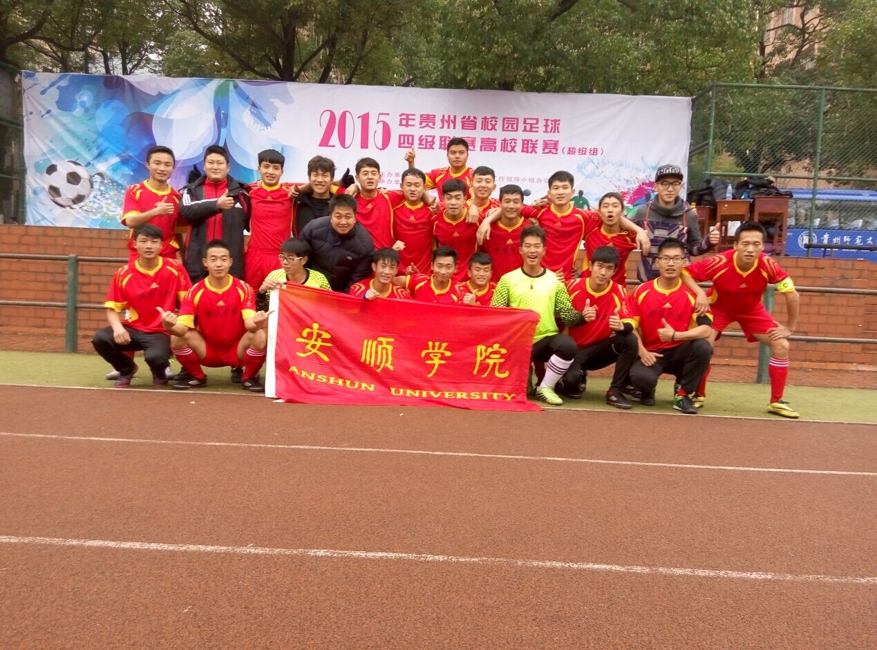 12月20日至12月28日,由贵州省校园足球领导小组办公室主办,贵州师范大学、贵州财经大学承办的2015年贵州省校园足球四级联赛高校联赛男子超级组比赛在贵州师范大学足球场落下帷幕。安顺学院男子足球队员经过激烈角逐,小组赛第一场2:0赢铜仁;第二场1:2输民大;第三场8:0赢遵义医学院;第四场0:1输贵州师范大学求是学院以小组第三名出线。在12月28日的5、6名决赛中,队员们拼尽全力,在比赛的下半场一开始殷浩洋以一记精彩的远射打开了对方大门,最终以1:0力克贵州民族大学获得第五名。