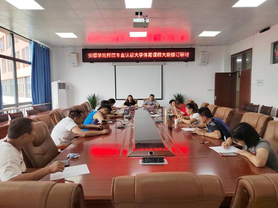 7月18日,安顺学院师范专业认证大学体育课程大纲修订研讨会在乐学楼二楼体育学院会议室召开,大体部主任邓文红、副主任雷蕾、大纲修订老师参加,会议由雷蕾主持。