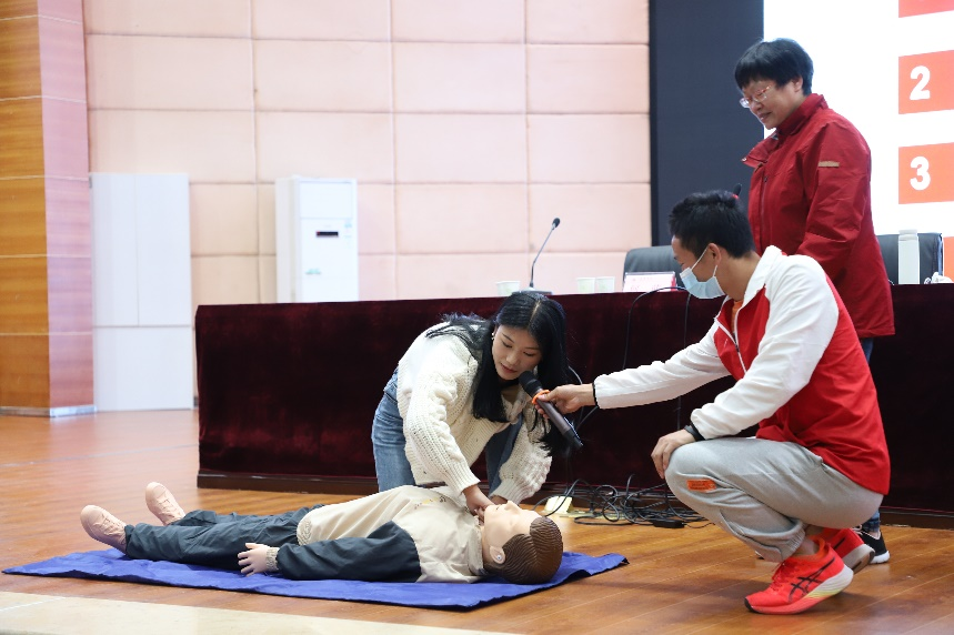 讲座上,何萌围绕伤情判断、止血、包扎、固定搬运等正确的创伤救护方法进行了详细讲解,并借助道具现场演示了操作步骤、精心示范了心肺复苏术、海姆利克急救法等救护技能。讲座以近期发生的踩踏事故为例,向大家强调了现场救护培训的重要性和必要性,应急救护的目的、原则和程序,并详细说明严重威胁生命的危险因素。