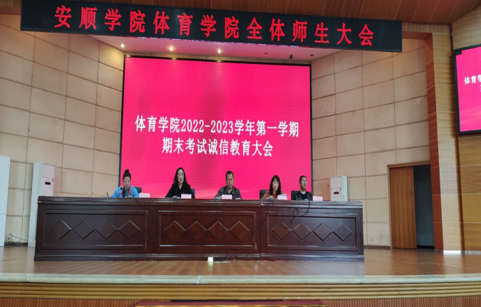 2022年11月21日14:00,体育学院在学术报告厅召开了2022-2023学年度第一学期期末考试动员暨诚信教育大会。党委书记孙黔、院长邓文红、副院长刘宁、副书记林金茹、大体部副主任雷雷、各科室负责人、班主任、任课教师、2020级、2021级、2022级全体学生、2019级部分学生,共计400余人参加会议。大会由邓文红院长主持。