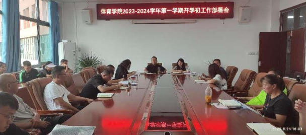 2023年8月24日下午,体育学院召开“2023-2024学年第一学期工作部署会”,会议由体育学院院长邓文红主持,党委书记孙黔、公体部副主任刘宁、副院长雷蕾以及全体教职工参加会议。