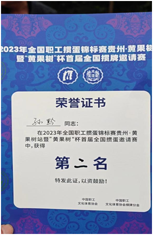 2023年12月16日,2023年全国职工掼蛋锦标赛贵州·黄果树站暨“黄果树”杯首届全国掼牌邀请赛在贵州省安顺市黄果树旅游区迎宾馆举行。经过激烈角逐,安顺学院体育学院党委书记孙黔及其队友刘坤在双人邀请赛中取得第二名的优异成绩,并将代表贵州参加全国总决赛。
