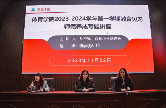 为贯彻加强师范生职业道德修养,积极提升教育实践能力,涵养人才培养的优良作风。2023年11月22日,我院邀请双阳小学副校长岳立辉老师在博学楼A-12教室举办主题《以德润身、以爱育人》的师德养成专题讲座。安顺学院大学公共体育教学部副主任刘宁老师及2021级、2022及全体同学们参加讲座,讲座由体育学院院长邓文红主持。