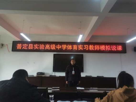考核内容为说课。早上10:00所有实习学生在综合楼二楼会议室依次进行说课,说课结束后,院长邓文红对说课情况进行总结讲评,指出说课存在的问题并提出建议,对给与我们帮助与指导的学校老师表达感谢之情,对所有实习生提出希望和要求,希望在今后的学习中,加强学习专业知识,认真钻研教材教法,为今后从事教师职业打下坚实的基础。最后普定县实验高级中学校长卢启程对所有实习生的进步以及对学校开展体育工作的付出表示肯定,同时对学院表达了感谢,也对所有实习生提出了希望和要求。
