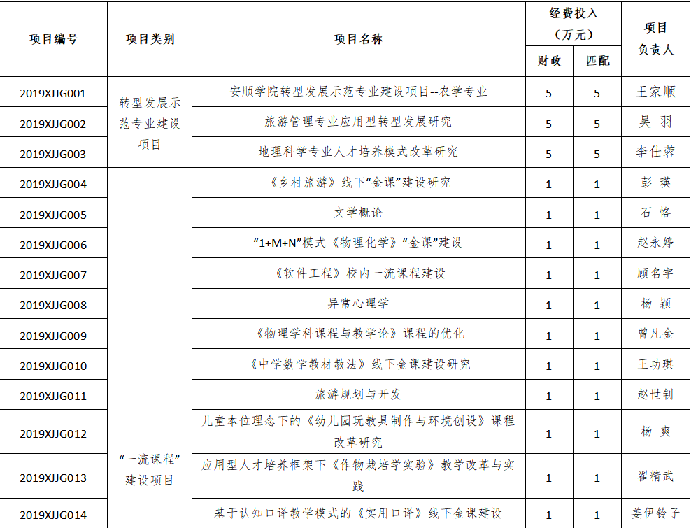 为深入贯彻习近平新时代中国特色社会主义思想和全国教育大会精神,推进全国高等学校本科教育工作会议精神落地生根,为进一步推动我校的转型发展,推进教育教学改革,提升人才培养质量,根据《教育部关于加快建设高水平本科教育全面提高人才培养能力的意见》(教高〔2018〕2号)、中共中央办公厅、国务院办公厅印发的《关于深化新时代学校思想政治理论课改革创新的若干意见》和《关于2019年度校级本科教学建设项目申报工作的通知》文件精神及相关要求,学校开展2019年校级本科教学建设项目申报相关工作,经申报、评审、公示等环节,现将准予立项项目予以公布,项目建设经费由《省财政厅 省教育厅关于下达2019年扶持市州高校教育质量提升工程专项经费的通知》(黔财教〔2019〕88号)项目经费中列支,并按照文件要求,给予各项目不低于1:1经费匹配(具体详见附件)。
