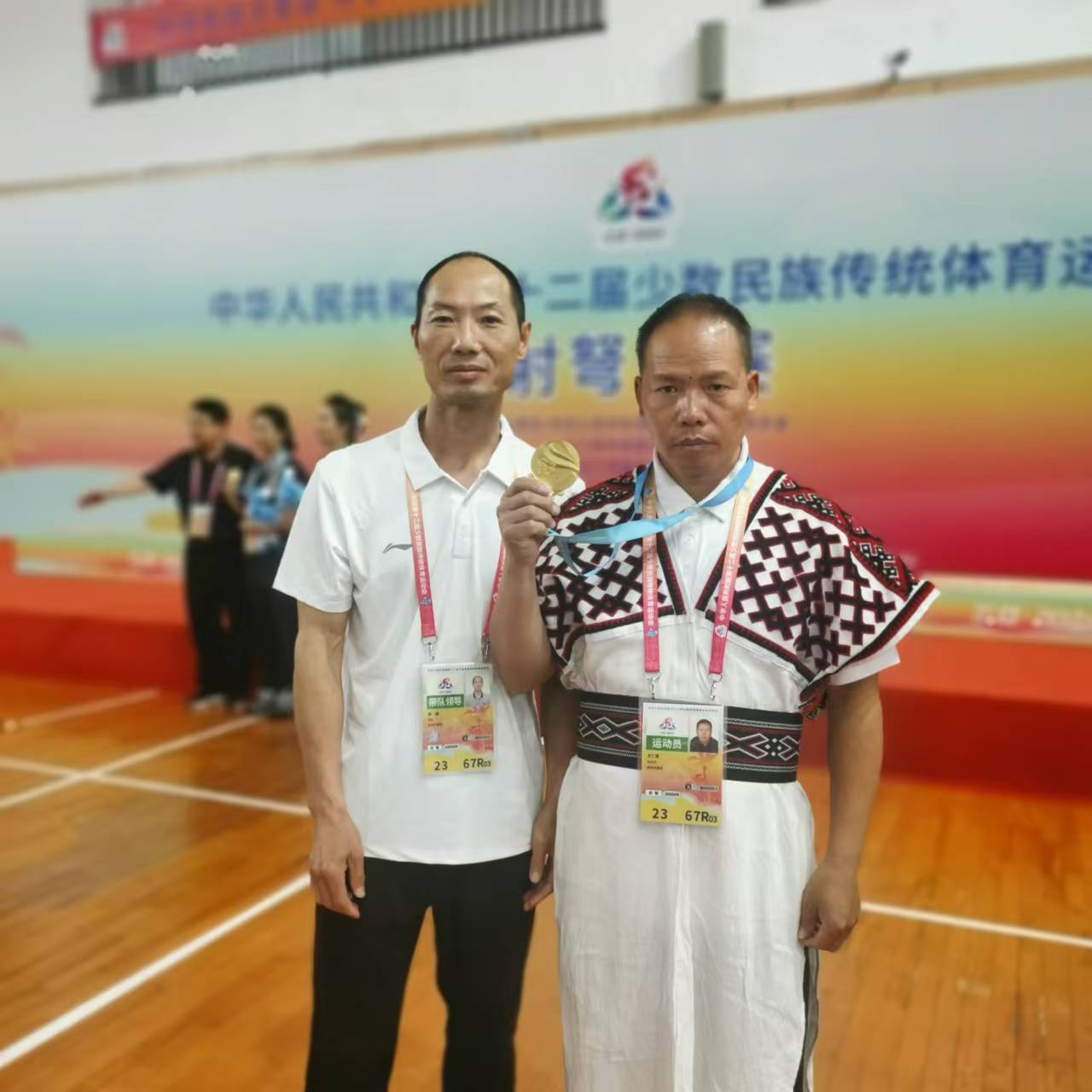 安顺学院教师王仁爱(右)荣获第十二届全国少数民族传统体育运动会射弩比赛金牌